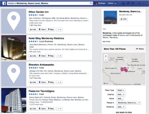 Dentro de la app actual de Facebook se puede ver “nearby places” pero esto no es lo mismo a lo ofrecido al nuevo directorio de lugares en el sitio web. No se puede buscar por un Hotel en Monterrey dentro de la app de Facebook actual y obtener los mismos resultados ofrecidos por la versión web del directorio de lugares.